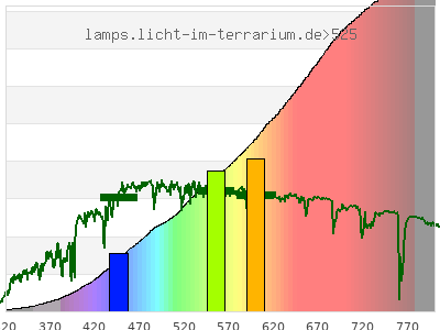 Whereas a spectrometer measures the intensity in every tiny wavelength interval resulting in thousands of individual intensities, the human eye only measures three intensities detected by the three cones. The same is true for the reptile eye with usually three or four photoreceptors. Effectively the detailled spectrum displayed above reduces to a much compacter bar graph displayed below. The photoreceptor sensitivites from these L-Cone, M-Cone, S-Cone, and U-Cone are used, they are chosen as an average of measured reptile photoreceptor sensitivity curves. The bar graph also shows as reference the intensity seen by the three or four photoreceptors for average sunlight (ASTM spectrum).
