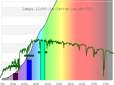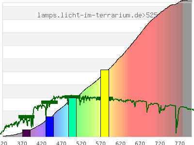 total ( 0 nm - 0 nm) 43500 µW/cm² = 435 W/m² UVC ( 0 nm - 280 nm) 12.3 µW/cm² = 0.123 W/m² non-terrestrial ( 0 nm - 290 nm) 17 µW/cm² = 0.17 W/m² total2 ( 250 nm - 880 nm) 43500 µW/cm² = 435 W/m² UVB (EU) ( 280 nm - 315 nm) 25 µW/cm² = 0.25 W/m² UVB (US) ( 280 nm - 320 nm) 31 µW/cm² = 0.31 W/m² UVA+B ( 280 nm - 380 nm) 259 µW/cm² = 2.59 W/m² Solar UVB ( 290 nm - 315 nm) 20.3 µW/cm² = 0.203 W/m² UVA D3 regulating ( 315 nm - 335 nm) 31.6 µW/cm² = 0.316 W/m² UVA (EU) ( 315 nm - 380 nm) 234 µW/cm² = 2.34 W/m² UVA2 (medical definition) ( 320 nm - 340 nm) 37.3 µW/cm² = 0.373 W/m² UVA (US) ( 320 nm - 380 nm) 228 µW/cm² = 2.28 W/m² UVA1 (variant) ( 335 nm - 380 nm) 202 µW/cm² = 2.02 W/m² UVA1 (medical) ( 340 nm - 400 nm) 393 µW/cm² = 3.93 W/m² vis. UVA ( 350 nm - 380 nm) 162 µW/cm² = 1.62 W/m² VIS Rep3 ( 350 nm - 600 nm) 11400 µW/cm² = 114 W/m² VIS Rep4 ( 350 nm - 700 nm) 24800 µW/cm² = 248 W/m² purple ( 380 nm - 420 nm) 525 µW/cm² = 5.25 W/m² VIS ( 380 nm - 780 nm) 39300 µW/cm² = 393 W/m² VIS2 ( 400 nm - 680 nm) 21200 µW/cm² = 212 W/m² PAR ( 400 nm - 700 nm) 24500 µW/cm² = 245 W/m² tmp ( 400 nm - 1100 nm) 43100 µW/cm² = 431 W/m² blue ( 420 nm - 490 nm) 2440 µW/cm² = 24.4 W/m² green ( 490 nm - 575 nm) 5840 µW/cm² = 58.4 W/m² yellow ( 575 nm - 585 nm) 908 µW/cm² = 9.08 W/m² orange ( 585 nm - 650 nm) 7400 µW/cm² = 74 W/m² red ( 650 nm - 780 nm) 22200 µW/cm² = 222 W/m² IR2 ( 655 nm - 685 nm) 4410 µW/cm² = 44.1 W/m² IRA ( 700 nm - 1400 nm) 18600 µW/cm² = 186 W/m² IRB ( 1400 nm - 3000 nm) 0 µW/cm² = 0 W/m²