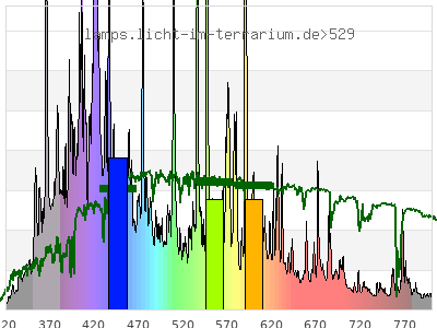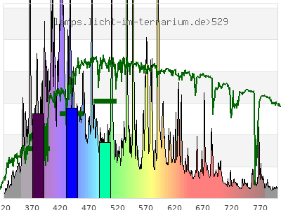 Whereas a spectrometer measures the intensity in every tiny wavelength interval resulting in thousands of individual intensities, the human eye only measures three intensities detected by the three cones. The same is true for the reptile eye with usually three or four photoreceptors. Effectively the detailled spectrum displayed above reduces to a much compacter bar graph displayed below. The photoreceptor sensitivites from these L-Cone, M-Cone, S-Cone, and U-Cone are used, they are chosen as an average of measured reptile photoreceptor sensitivity curves. The bar graph also shows as reference the intensity seen by the three or four photoreceptors for average sunlight (ASTM spectrum).