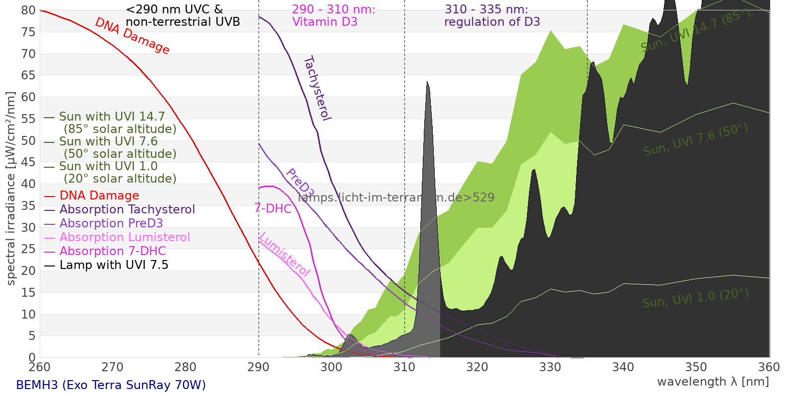 This process prevents any overdose of vitamin D3 from UV radiation with a spectrum similar to sunlight. As a comparison the solar spectra at 20°(id:14) and at 85°(id:21) solar angle are shown.