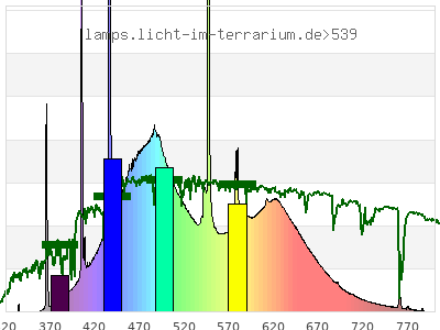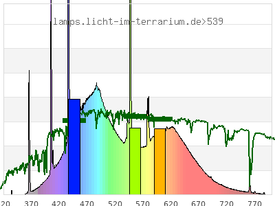 total ( 0 nm - 0 nm) 899 µW/cm² = 8.99 W/m² UVC ( 0 nm - 280 nm) 0 µW/cm² = 0 W/m² non-terrestrial ( 0 nm - 290 nm) 0 µW/cm² = 0 W/m² total2 ( 250 nm - 880 nm) 899 µW/cm² = 8.99 W/m² UVB (EU) ( 280 nm - 315 nm) 1.73 µW/cm² = 0.0173 W/m² UVB (US) ( 280 nm - 320 nm) 1.73 µW/cm² = 0.0173 W/m² UVA+B ( 280 nm - 380 nm) 13.5 µW/cm² = 0.135 W/m² Solar UVB ( 290 nm - 315 nm) 1.73 µW/cm² = 0.0173 W/m² UVA D3 regulating ( 315 nm - 335 nm) 0.202 µW/cm² = 0.00202 W/m² UVA (EU) ( 315 nm - 380 nm) 11.8 µW/cm² = 0.118 W/m² UVA2 (medical definition) ( 320 nm - 340 nm) 0.201 µW/cm² = 0.00201 W/m² UVA (US) ( 320 nm - 380 nm) 11.8 µW/cm² = 0.118 W/m² UVA1 (variant) ( 335 nm - 380 nm) 11.6 µW/cm² = 0.116 W/m² UVA1 (medical) ( 340 nm - 400 nm) 21.8 µW/cm² = 0.218 W/m² vis. UVA ( 350 nm - 380 nm) 11.6 µW/cm² = 0.116 W/m² VIS Rep3 ( 350 nm - 600 nm) 690 µW/cm² = 6.9 W/m² VIS Rep4 ( 350 nm - 700 nm) 878 µW/cm² = 8.78 W/m² purple ( 380 nm - 420 nm) 53.9 µW/cm² = 0.539 W/m² VIS ( 380 nm - 780 nm) 885 µW/cm² = 8.85 W/m² VIS2 ( 400 nm - 680 nm) 842 µW/cm² = 8.42 W/m² PAR ( 400 nm - 700 nm) 856 µW/cm² = 8.56 W/m² tmp ( 400 nm - 1100 nm) 875 µW/cm² = 8.75 W/m² blue ( 420 nm - 490 nm) 296 µW/cm² = 2.96 W/m² green ( 490 nm - 575 nm) 262 µW/cm² = 2.62 W/m² yellow ( 575 nm - 585 nm) 29 µW/cm² = 0.29 W/m² orange ( 585 nm - 650 nm) 168 µW/cm² = 1.68 W/m² red ( 650 nm - 780 nm) 75.9 µW/cm² = 0.759 W/m² IR2 ( 655 nm - 685 nm) 37.9 µW/cm² = 0.379 W/m² IRA ( 700 nm - 1400 nm) 18.6 µW/cm² = 0.186 W/m² IRB ( 1400 nm - 3000 nm) 0 µW/cm² = 0 W/m²