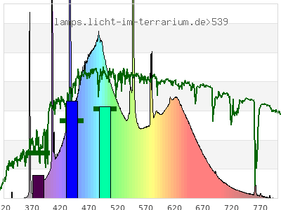 Whereas a spectrometer measures the intensity in every tiny wavelength interval resulting in thousands of individual intensities, the human eye only measures three intensities detected by the three cones. The same is true for the reptile eye with usually three or four photoreceptors. Effectively the detailled spectrum displayed above reduces to a much compacter bar graph displayed below. The photoreceptor sensitivites from these L-Cone, M-Cone, S-Cone, and U-Cone are used, they are chosen as an average of measured reptile photoreceptor sensitivity curves. The bar graph also shows as reference the intensity seen by the three or four photoreceptors for average sunlight (ASTM spectrum).