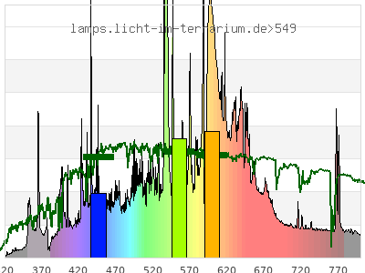 Whereas a spectrometer measures the intensity in every tiny wavelength interval resulting in thousands of individual intensities, the human eye only measures three intensities detected by the three cones. The same is true for the reptile eye with usually three or four photoreceptors. Effectively the detailled spectrum displayed above reduces to a much compacter bar graph displayed below. The photoreceptor sensitivites from these L-Cone, M-Cone, S-Cone, and U-Cone are used, they are chosen as an average of measured reptile photoreceptor sensitivity curves. The bar graph also shows as reference the intensity seen by the three or four photoreceptors for average sunlight (ASTM spectrum).