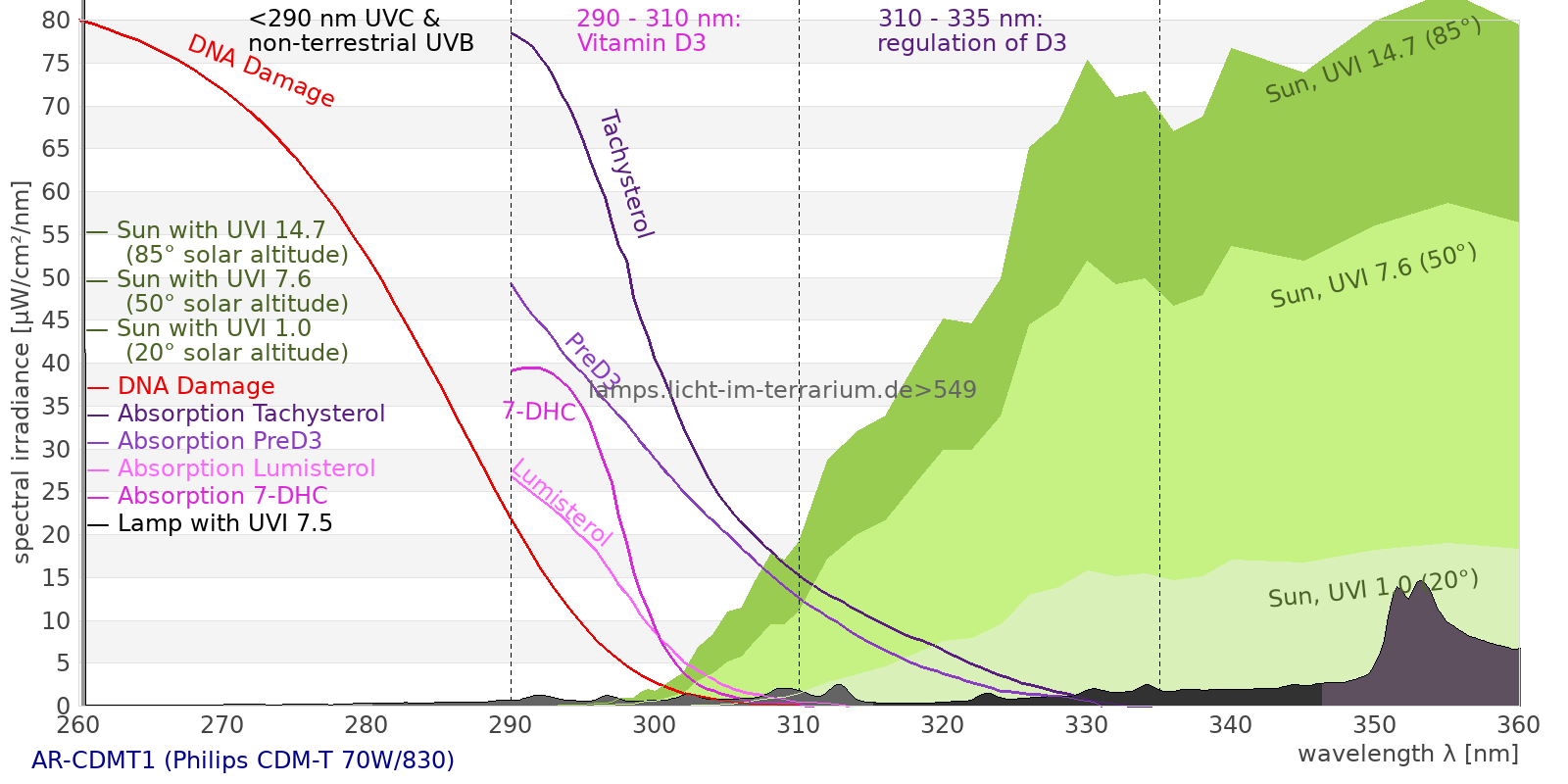 This process prevents any overdose of vitamin D3 from UV radiation with a spectrum similar to sunlight. As a comparison the solar spectra at 20°(id:14) and at 85°(id:21) solar angle are shown.
