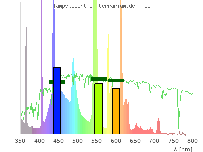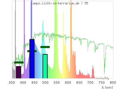 Whereas a spectrometer measures the intensity in every tiny wavelength interval resulting in thousands of individual intensities, the human eye only measures three intensities detected by the three cones. The same is true for the reptile eye with usually three or four photoreceptors. Effectively the detailled spectrum displayed above reduces to a much compacter bar graph displayed below. The photoreceptor sensitivites from these L-Cone, M-Cone, S-Cone, and U-Cone are used, they are chosen as an average of measured reptile photoreceptor sensitivity curves. The bar graph also shows as reference the intensity seen by the three or four photoreceptors for average sunlight (id 1).
