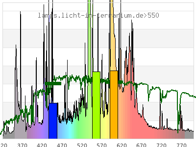Whereas a spectrometer measures the intensity in every tiny wavelength interval resulting in thousands of individual intensities, the human eye only measures three intensities detected by the three cones. The same is true for the reptile eye with usually three or four photoreceptors. Effectively the detailled spectrum displayed above reduces to a much compacter bar graph displayed below. The photoreceptor sensitivites from these L-Cone, M-Cone, S-Cone, and U-Cone are used, they are chosen as an average of measured reptile photoreceptor sensitivity curves. The bar graph also shows as reference the intensity seen by the three or four photoreceptors for average sunlight (ASTM spectrum).