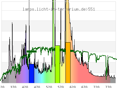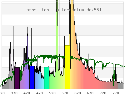 Whereas a spectrometer measures the intensity in every tiny wavelength interval resulting in thousands of individual intensities, the human eye only measures three intensities detected by the three cones. The same is true for the reptile eye with usually three or four photoreceptors. Effectively the detailled spectrum displayed above reduces to a much compacter bar graph displayed below. The photoreceptor sensitivites from these L-Cone, M-Cone, S-Cone, and U-Cone are used, they are chosen as an average of measured reptile photoreceptor sensitivity curves. The bar graph also shows as reference the intensity seen by the three or four photoreceptors for average sunlight (ASTM spectrum).