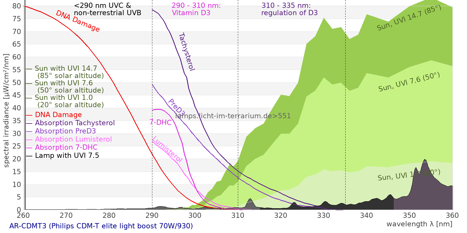 This process prevents any overdose of vitamin D3 from UV radiation with a spectrum similar to sunlight. As a comparison the solar spectra at 20°(id:14) and at 85°(id:21) solar angle are shown.