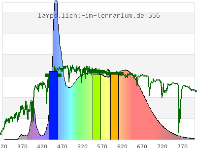 total ( 0 nm - 0 nm) 59600 µW/cm² = 596 W/m² UVC ( 0 nm - 280 nm) 0 µW/cm² = 0 W/m² non-terrestrial ( 0 nm - 290 nm) 0 µW/cm² = 0 W/m² total2 ( 250 nm - 880 nm) 59600 µW/cm² = 596 W/m² UVB (EU) ( 280 nm - 315 nm) 0 µW/cm² = 0 W/m² UVB (US) ( 280 nm - 320 nm) 0 µW/cm² = 0 W/m² UVA+B ( 280 nm - 380 nm) 324 µW/cm² = 3.24 W/m² Solar UVB ( 290 nm - 315 nm) 0 µW/cm² = 0 W/m² UVA D3 regulating ( 315 nm - 335 nm) 8.67 µW/cm² = 0.0867 W/m² UVA (EU) ( 315 nm - 380 nm) 324 µW/cm² = 3.24 W/m² UVA2 (medical definition) ( 320 nm - 340 nm) 12.7 µW/cm² = 0.127 W/m² UVA (US) ( 320 nm - 380 nm) 324 µW/cm² = 3.24 W/m² UVA1 (variant) ( 335 nm - 380 nm) 315 µW/cm² = 3.15 W/m² UVA1 (medical) ( 340 nm - 400 nm) 1530 µW/cm² = 15.3 W/m² vis. UVA ( 350 nm - 380 nm) 306 µW/cm² = 3.06 W/m² VIS Rep3 ( 350 nm - 600 nm) 39500 µW/cm² = 395 W/m² VIS Rep4 ( 350 nm - 700 nm) 57100 µW/cm² = 571 W/m² purple ( 380 nm - 420 nm) 1830 µW/cm² = 18.3 W/m² VIS ( 380 nm - 780 nm) 59200 µW/cm² = 592 W/m² VIS2 ( 400 nm - 680 nm) 53600 µW/cm² = 536 W/m² PAR ( 400 nm - 700 nm) 55600 µW/cm² = 556 W/m² tmp ( 400 nm - 1100 nm) 58100 µW/cm² = 581 W/m² blue ( 420 nm - 490 nm) 14800 µW/cm² = 148 W/m² green ( 490 nm - 575 nm) 17400 µW/cm² = 174 W/m² yellow ( 575 nm - 585 nm) 2020 µW/cm² = 20.2 W/m² orange ( 585 nm - 650 nm) 13900 µW/cm² = 139 W/m² red ( 650 nm - 780 nm) 9170 µW/cm² = 91.7 W/m² IR2 ( 655 nm - 685 nm) 4450 µW/cm² = 44.5 W/m² IRA ( 700 nm - 1400 nm) 2480 µW/cm² = 24.8 W/m² IRB ( 1400 nm - 3000 nm) 0 µW/cm² = 0 W/m²