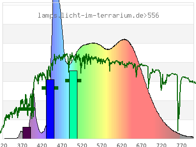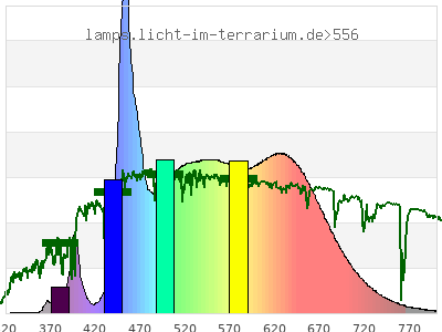 Whereas a spectrometer measures the intensity in every tiny wavelength interval resulting in thousands of individual intensities, the human eye only measures three intensities detected by the three cones. The same is true for the reptile eye with usually three or four photoreceptors. Effectively the detailled spectrum displayed above reduces to a much compacter bar graph displayed below. The photoreceptor sensitivites from these L-Cone, M-Cone, S-Cone, and U-Cone are used, they are chosen as an average of measured reptile photoreceptor sensitivity curves. The bar graph also shows as reference the intensity seen by the three or four photoreceptors for average sunlight (ASTM spectrum).