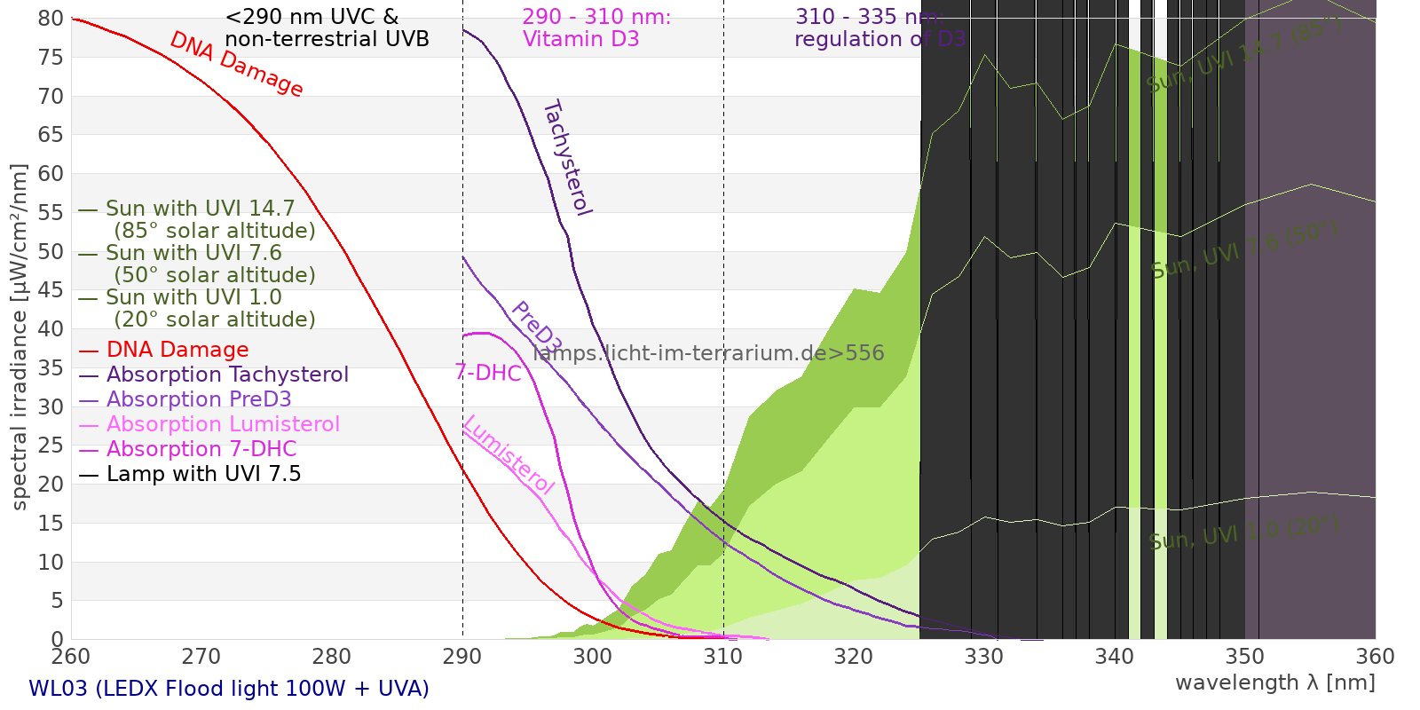 This process prevents any overdose of vitamin D3 from UV radiation with a spectrum similar to sunlight. As a comparison the solar spectra at 20°(id:14) and at 85°(id:21) solar angle are shown.