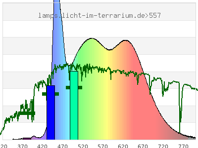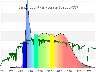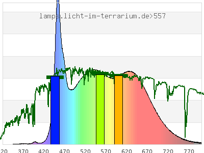 total ( 0 nm - 0 nm) 21000 µW/cm² = 210 W/m² UVC ( 0 nm - 280 nm) 0 µW/cm² = 0 W/m² non-terrestrial ( 0 nm - 290 nm) 0 µW/cm² = 0 W/m² total2 ( 250 nm - 880 nm) 21000 µW/cm² = 210 W/m² UVB (EU) ( 280 nm - 315 nm) 0 µW/cm² = 0 W/m² UVB (US) ( 280 nm - 320 nm) 0 µW/cm² = 0 W/m² UVA+B ( 280 nm - 380 nm) 24.8 µW/cm² = 0.248 W/m² Solar UVB ( 290 nm - 315 nm) 0 µW/cm² = 0 W/m² UVA D3 regulating ( 315 nm - 335 nm) 0 µW/cm² = 0 W/m² UVA (EU) ( 315 nm - 380 nm) 24.8 µW/cm² = 0.248 W/m² UVA2 (medical definition) ( 320 nm - 340 nm) 0 µW/cm² = 0 W/m² UVA (US) ( 320 nm - 380 nm) 24.8 µW/cm² = 0.248 W/m² UVA1 (variant) ( 335 nm - 380 nm) 24.8 µW/cm² = 0.248 W/m² UVA1 (medical) ( 340 nm - 400 nm) 60.4 µW/cm² = 0.604 W/m² vis. UVA ( 350 nm - 380 nm) 22.2 µW/cm² = 0.222 W/m² VIS Rep3 ( 350 nm - 600 nm) 13600 µW/cm² = 136 W/m² VIS Rep4 ( 350 nm - 700 nm) 20000 µW/cm² = 200 W/m² purple ( 380 nm - 420 nm) 78 µW/cm² = 0.78 W/m² VIS ( 380 nm - 780 nm) 20900 µW/cm² = 209 W/m² VIS2 ( 400 nm - 680 nm) 19200 µW/cm² = 192 W/m² PAR ( 400 nm - 700 nm) 20000 µW/cm² = 200 W/m² tmp ( 400 nm - 1100 nm) 21000 µW/cm² = 210 W/m² blue ( 420 nm - 490 nm) 5150 µW/cm² = 51.5 W/m² green ( 490 nm - 575 nm) 6510 µW/cm² = 65.1 W/m² yellow ( 575 nm - 585 nm) 751 µW/cm² = 7.51 W/m² orange ( 585 nm - 650 nm) 5030 µW/cm² = 50.3 W/m² red ( 650 nm - 780 nm) 3430 µW/cm² = 34.3 W/m² IR2 ( 655 nm - 685 nm) 1640 µW/cm² = 16.4 W/m² IRA ( 700 nm - 1400 nm) 972 µW/cm² = 9.72 W/m² IRB ( 1400 nm - 3000 nm) 0 µW/cm² = 0 W/m²