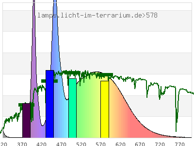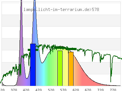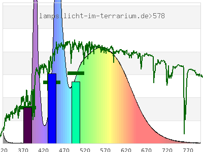 Whereas a spectrometer measures the intensity in every tiny wavelength interval resulting in thousands of individual intensities, the human eye only measures three intensities detected by the three cones. The same is true for the reptile eye with usually three or four photoreceptors. Effectively the detailled spectrum displayed above reduces to a much compacter bar graph displayed below. The photoreceptor sensitivites from these L-Cone, M-Cone, S-Cone, and U-Cone are used, they are chosen as an average of measured reptile photoreceptor sensitivity curves. The bar graph also shows as reference the intensity seen by the three or four photoreceptors for average sunlight (ASTM spectrum).