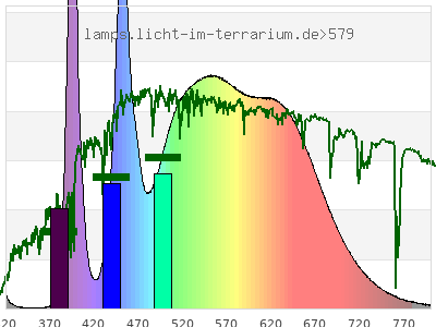 total ( 0 nm - 0 nm) 1970 µW/cm² = 19.7 W/m² UVC ( 0 nm - 280 nm) 0 µW/cm² = 0 W/m² non-terrestrial ( 0 nm - 290 nm) 0.825 µW/cm² = 0.00825 W/m² total2 ( 250 nm - 880 nm) 1970 µW/cm² = 19.7 W/m² UVB (EU) ( 280 nm - 315 nm) 46.8 µW/cm² = 0.468 W/m² UVB (US) ( 280 nm - 320 nm) 50.7 µW/cm² = 0.507 W/m² UVA+B ( 280 nm - 380 nm) 59.1 µW/cm² = 0.591 W/m² Solar UVB ( 290 nm - 315 nm) 46 µW/cm² = 0.46 W/m² UVA D3 regulating ( 315 nm - 335 nm) 6.42 µW/cm² = 0.0642 W/m² UVA (EU) ( 315 nm - 380 nm) 12.3 µW/cm² = 0.123 W/m² UVA2 (medical definition) ( 320 nm - 340 nm) 2.78 µW/cm² = 0.0278 W/m² UVA (US) ( 320 nm - 380 nm) 8.4 µW/cm² = 0.084 W/m² UVA1 (variant) ( 335 nm - 380 nm) 5.86 µW/cm² = 0.0586 W/m² UVA1 (medical) ( 340 nm - 400 nm) 186 µW/cm² = 1.86 W/m² vis. UVA ( 350 nm - 380 nm) 5.21 µW/cm² = 0.0521 W/m² VIS Rep3 ( 350 nm - 600 nm) 1340 µW/cm² = 13.4 W/m² VIS Rep4 ( 350 nm - 700 nm) 1840 µW/cm² = 18.4 W/m² purple ( 380 nm - 420 nm) 245 µW/cm² = 2.45 W/m² VIS ( 380 nm - 780 nm) 1910 µW/cm² = 19.1 W/m² VIS2 ( 400 nm - 680 nm) 1600 µW/cm² = 16 W/m² PAR ( 400 nm - 700 nm) 1660 µW/cm² = 16.6 W/m² tmp ( 400 nm - 1100 nm) 1740 µW/cm² = 17.4 W/m² blue ( 420 nm - 490 nm) 368 µW/cm² = 3.68 W/m² green ( 490 nm - 575 nm) 553 µW/cm² = 5.53 W/m² yellow ( 575 nm - 585 nm) 69.3 µW/cm² = 0.693 W/m² orange ( 585 nm - 650 nm) 414 µW/cm² = 4.14 W/m² red ( 650 nm - 780 nm) 259 µW/cm² = 2.59 W/m² IR2 ( 655 nm - 685 nm) 125 µW/cm² = 1.25 W/m² IRA ( 700 nm - 1400 nm) 76.1 µW/cm² = 0.761 W/m² IRB ( 1400 nm - 3000 nm) 0 µW/cm² = 0 W/m²