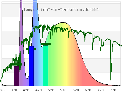 Whereas a spectrometer measures the intensity in every tiny wavelength interval resulting in thousands of individual intensities, the human eye only measures three intensities detected by the three cones. The same is true for the reptile eye with usually three or four photoreceptors. Effectively the detailled spectrum displayed above reduces to a much compacter bar graph displayed below. The photoreceptor sensitivites from these L-Cone, M-Cone, S-Cone, and U-Cone are used, they are chosen as an average of measured reptile photoreceptor sensitivity curves. The bar graph also shows as reference the intensity seen by the three or four photoreceptors for average sunlight (ASTM spectrum).