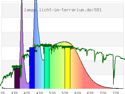 total ( 0 nm - 0 nm) 1780 µW/cm² = 17.8 W/m² UVC ( 0 nm - 280 nm) 0 µW/cm² = 0 W/m² non-terrestrial ( 0 nm - 290 nm) 0.772 µW/cm² = 0.00772 W/m² total2 ( 250 nm - 880 nm) 1780 µW/cm² = 17.8 W/m² UVB (EU) ( 280 nm - 315 nm) 42.7 µW/cm² = 0.427 W/m² UVB (US) ( 280 nm - 320 nm) 45.2 µW/cm² = 0.452 W/m² UVA+B ( 280 nm - 380 nm) 50.1 µW/cm² = 0.501 W/m² Solar UVB ( 290 nm - 315 nm) 41.9 µW/cm² = 0.419 W/m² UVA D3 regulating ( 315 nm - 335 nm) 4.46 µW/cm² = 0.0446 W/m² UVA (EU) ( 315 nm - 380 nm) 7.4 µW/cm² = 0.074 W/m² UVA2 (medical definition) ( 320 nm - 340 nm) 2.19 µW/cm² = 0.0219 W/m² UVA (US) ( 320 nm - 380 nm) 4.89 µW/cm² = 0.0489 W/m² UVA1 (variant) ( 335 nm - 380 nm) 2.94 µW/cm² = 0.0294 W/m² UVA1 (medical) ( 340 nm - 400 nm) 116 µW/cm² = 1.16 W/m² vis. UVA ( 350 nm - 380 nm) 2.29 µW/cm² = 0.0229 W/m² VIS Rep3 ( 350 nm - 600 nm) 1390 µW/cm² = 13.9 W/m² VIS Rep4 ( 350 nm - 700 nm) 1710 µW/cm² = 17.1 W/m² purple ( 380 nm - 420 nm) 202 µW/cm² = 2.02 W/m² VIS ( 380 nm - 780 nm) 1730 µW/cm² = 17.3 W/m² VIS2 ( 400 nm - 680 nm) 1580 µW/cm² = 15.8 W/m² PAR ( 400 nm - 700 nm) 1590 µW/cm² = 15.9 W/m² tmp ( 400 nm - 1100 nm) 1620 µW/cm² = 16.2 W/m² blue ( 420 nm - 490 nm) 457 µW/cm² = 4.57 W/m² green ( 490 nm - 575 nm) 557 µW/cm² = 5.57 W/m² yellow ( 575 nm - 585 nm) 72.9 µW/cm² = 0.729 W/m² orange ( 585 nm - 650 nm) 342 µW/cm² = 3.42 W/m² red ( 650 nm - 780 nm) 95.8 µW/cm² = 0.958 W/m² IR2 ( 655 nm - 685 nm) 50.6 µW/cm² = 0.506 W/m² IRA ( 700 nm - 1400 nm) 22.7 µW/cm² = 0.227 W/m² IRB ( 1400 nm - 3000 nm) 0 µW/cm² = 0 W/m²