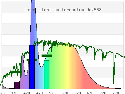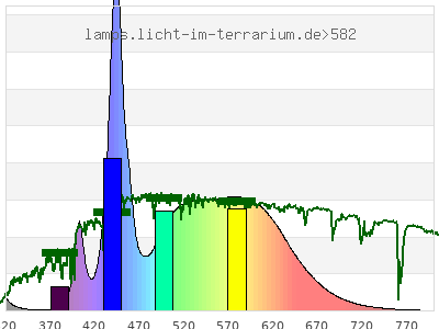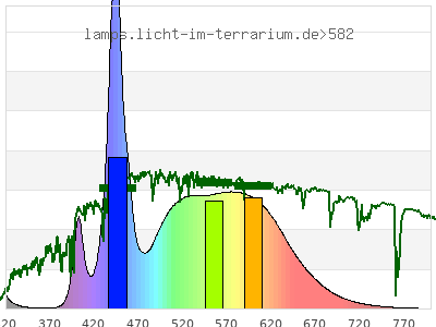 total ( 0 nm - 0 nm) 4620 µW/cm² = 46.2 W/m² UVC ( 0 nm - 280 nm) 0.227 µW/cm² = 0.00227 W/m² non-terrestrial ( 0 nm - 290 nm) 1.12 µW/cm² = 0.0112 W/m² total2 ( 250 nm - 880 nm) 4620 µW/cm² = 46.2 W/m² UVB (EU) ( 280 nm - 315 nm) 96.4 µW/cm² = 0.964 W/m² UVB (US) ( 280 nm - 320 nm) 110 µW/cm² = 1.1 W/m² UVA+B ( 280 nm - 380 nm) 136 µW/cm² = 1.36 W/m² Solar UVB ( 290 nm - 315 nm) 95.5 µW/cm² = 0.955 W/m² UVA D3 regulating ( 315 nm - 335 nm) 30 µW/cm² = 0.3 W/m² UVA (EU) ( 315 nm - 380 nm) 39.7 µW/cm² = 0.397 W/m² UVA2 (medical definition) ( 320 nm - 340 nm) 18.2 µW/cm² = 0.182 W/m² UVA (US) ( 320 nm - 380 nm) 25.7 µW/cm² = 0.257 W/m² UVA1 (variant) ( 335 nm - 380 nm) 9.65 µW/cm² = 0.0965 W/m² UVA1 (medical) ( 340 nm - 400 nm) 88.8 µW/cm² = 0.888 W/m² vis. UVA ( 350 nm - 380 nm) 5.04 µW/cm² = 0.0504 W/m² VIS Rep3 ( 350 nm - 600 nm) 3590 µW/cm² = 35.9 W/m² VIS Rep4 ( 350 nm - 700 nm) 4440 µW/cm² = 44.4 W/m² purple ( 380 nm - 420 nm) 251 µW/cm² = 2.51 W/m² VIS ( 380 nm - 780 nm) 4480 µW/cm² = 44.8 W/m² VIS2 ( 400 nm - 680 nm) 4310 µW/cm² = 43.1 W/m² PAR ( 400 nm - 700 nm) 4350 µW/cm² = 43.5 W/m² tmp ( 400 nm - 1100 nm) 4400 µW/cm² = 44 W/m² blue ( 420 nm - 490 nm) 1490 µW/cm² = 14.9 W/m² green ( 490 nm - 575 nm) 1400 µW/cm² = 14 W/m² yellow ( 575 nm - 585 nm) 178 µW/cm² = 1.78 W/m² orange ( 585 nm - 650 nm) 906 µW/cm² = 9.06 W/m² red ( 650 nm - 780 nm) 252 µW/cm² = 2.52 W/m² IR2 ( 655 nm - 685 nm) 135 µW/cm² = 1.35 W/m² IRA ( 700 nm - 1400 nm) 49.1 µW/cm² = 0.491 W/m² IRB ( 1400 nm - 3000 nm) 0 µW/cm² = 0 W/m²