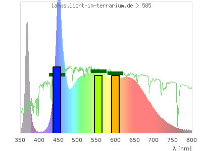 Whereas a spectrometer measures the intensity in every tiny wavelength interval resulting in thousands of individual intensities, the human eye only measures three intensities detected by the three cones. The same is true for the reptile eye with usually three or four photoreceptors. Effectively the detailled spectrum displayed above reduces to a much compacter bar graph displayed below. The photoreceptor sensitivites from these L-Cone, M-Cone, S-Cone, and U-Cone are used, they are chosen as an average of measured reptile photoreceptor sensitivity curves. The bar graph also shows as reference the intensity seen by the three or four photoreceptors for average sunlight (id 1).
