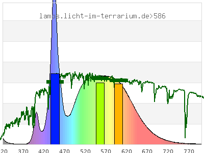 Erythema 2.56 UV-Index Pyrimidine dimerization of DNA 14.4 µW/cm² Photoceratitis 3.85 µW/cm² Photoconjunctivitis 0.257 µW/cm² DNA Damage 0.657 Vitamin D3 9.91 µW/cm² Photosynthesis 768 µW/cm² Luminosity 3550 lx Human L-Cone 528 µW/cm² Human M-Cone 447 µW/cm² Human S-Cone 304 µW/cm² CIE X 484 µW/cm² CIE Y 494 µW/cm² CIE Z 566 µW/cm² PAR PPFD 51 µmol/m²/s Extinction preD3 42 e-3*m²/mol Extinction Tachysterol 144 e-3*m²/mol Exctincition PreD3 20900 m²/mol Extinction Lumisterol 16.7 m²/mol Exctincition Tachysterol 183000 m²/mol Extinction 7DHC 18.7 m²/mol L-Cone 442 µW/cm² M-Cone 404 µW/cm² S-Cone 524 µW/cm² U-Cone 71.8 µW/cm² UVR - ICNIRP 2004 2.76 Rel Biol Eff Melatonin Supression 386 µW/cm² Blue Light Hazard 323 µW/cm² (91 µW/cm² per 1000 lx) CIE 174:2006 PreVit D3 11 µW/cm² Lumen Reptil 3380 "pseudo-lx" Vitamin D3 Degradation 6.08 µW/cm² Actinic UV 2.73 µW/cm² (7.67 mW/klm) Exctincition Lumisterol 20600 m²/mol Exctincition 7DHC 22600 m²/mol Exctincition Toxisterols 2070 m²/mol