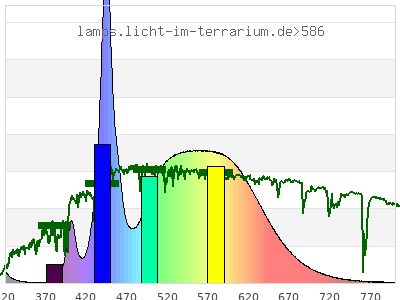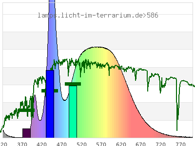 Whereas a spectrometer measures the intensity in every tiny wavelength interval resulting in thousands of individual intensities, the human eye only measures three intensities detected by the three cones. The same is true for the reptile eye with usually three or four photoreceptors. Effectively the detailled spectrum displayed above reduces to a much compacter bar graph displayed below. The photoreceptor sensitivites from these L-Cone, M-Cone, S-Cone, and U-Cone are used, they are chosen as an average of measured reptile photoreceptor sensitivity curves. The bar graph also shows as reference the intensity seen by the three or four photoreceptors for average sunlight (ASTM spectrum).