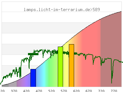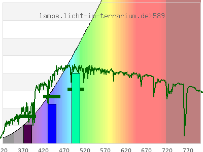 Erythema 3.97 UV-Index Pyrimidine dimerization of DNA 7.15 µW/cm² Photoceratitis 5.37 µW/cm² Photoconjunctivitis 3.44 µW/cm² DNA Damage 4.83 Vitamin D3 8.15 µW/cm² Photosynthesis 3540 µW/cm² Luminosity 13600 lx Human L-Cone 2120 µW/cm² Human M-Cone 1520 µW/cm² Human S-Cone 441 µW/cm² CIE X 2010 µW/cm² CIE Y 1890 µW/cm² CIE Z 842 µW/cm² PAR PPFD 248 µmol/m²/s Extinction preD3 66.7 e-3*m²/mol Extinction Tachysterol 197 e-3*m²/mol Exctincition PreD3 51900 m²/mol Extinction Lumisterol 50.9 m²/mol Exctincition Tachysterol 256000 m²/mol Extinction 7DHC 63 m²/mol L-Cone 1950 µW/cm² M-Cone 1200 µW/cm² S-Cone 673 µW/cm² U-Cone 316 µW/cm² UVR - ICNIRP 2004 6.61 Rel Biol Eff Melatonin Supression 752 µW/cm² Blue Light Hazard 503 µW/cm² (37 µW/cm² per 1000 lx) CIE 174:2006 PreVit D3 8.43 µW/cm² Lumen Reptil 10700 "pseudo-lx" Vitamin D3 Degradation 6.13 µW/cm² Actinic UV 6.58 µW/cm² (4.84 mW/klm) Exctincition Lumisterol 56400 m²/mol Exctincition 7DHC 68800 m²/mol Exctincition Toxisterols 15900 m²/mol