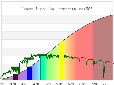 Whereas a spectrometer measures the intensity in every tiny wavelength interval resulting in thousands of individual intensities, the human eye only measures three intensities detected by the three cones. The same is true for the reptile eye with usually three or four photoreceptors. Effectively the detailled spectrum displayed above reduces to a much compacter bar graph displayed below. The photoreceptor sensitivites from these L-Cone, M-Cone, S-Cone, and U-Cone are used, they are chosen as an average of measured reptile photoreceptor sensitivity curves. The bar graph also shows as reference the intensity seen by the three or four photoreceptors for average sunlight (ASTM spectrum).