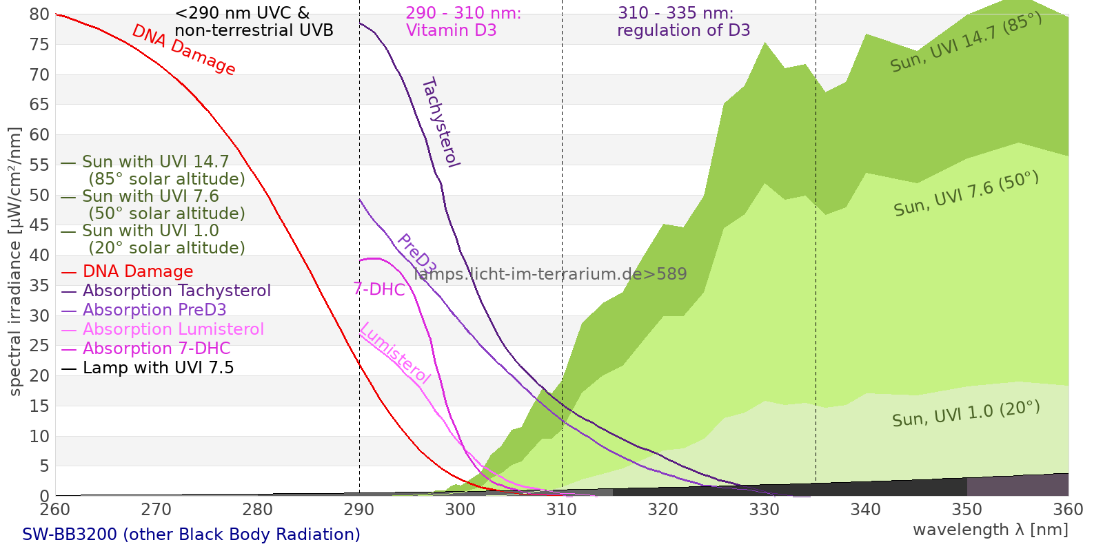 This process prevents any overdose of vitamin D3 from UV radiation with a spectrum similar to sunlight. As a comparison the solar spectra at 20°(id:14) and at 85°(id:21) solar angle are shown.