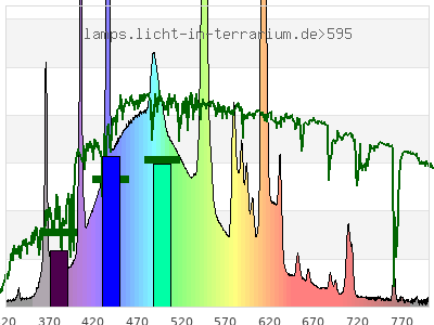 Whereas a spectrometer measures the intensity in every tiny wavelength interval resulting in thousands of individual intensities, the human eye only measures three intensities detected by the three cones. The same is true for the reptile eye with usually three or four photoreceptors. Effectively the detailled spectrum displayed above reduces to a much compacter bar graph displayed below. The photoreceptor sensitivites from these L-Cone, M-Cone, S-Cone, and U-Cone are used, they are chosen as an average of measured reptile photoreceptor sensitivity curves. The bar graph also shows as reference the intensity seen by the three or four photoreceptors for average sunlight (ASTM spectrum).