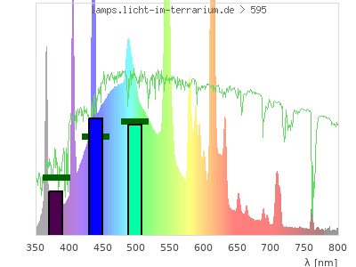 Whereas a spectrometer measures the intensity in every tiny wavelength interval resulting in thousands of individual intensities, the human eye only measures three intensities detected by the three cones. The same is true for the reptile eye with usually three or four photoreceptors. Effectively the detailled spectrum displayed above reduces to a much compacter bar graph displayed below. The photoreceptor sensitivites from these L-Cone, M-Cone, S-Cone, and U-Cone are used, they are chosen as an average of measured reptile photoreceptor sensitivity curves. The bar graph also shows as reference the intensity seen by the three or four photoreceptors for average sunlight (id 1).