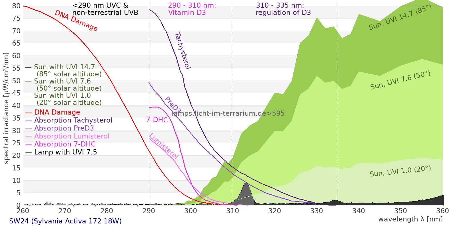 This process prevents any overdose of vitamin D3 from UV radiation with a spectrum similar to sunlight. As a comparison the solar spectra at 20°(id:14) and at 85°(id:21) solar angle are shown.