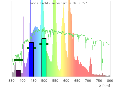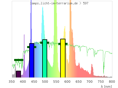 Whereas a spectrometer measures the intensity in every tiny wavelength interval resulting in thousands of individual intensities, the human eye only measures three intensities detected by the three cones. The same is true for the reptile eye with usually three or four photoreceptors. Effectively the detailled spectrum displayed above reduces to a much compacter bar graph displayed below. The photoreceptor sensitivites from these L-Cone, M-Cone, S-Cone, and U-Cone are used, they are chosen as an average of measured reptile photoreceptor sensitivity curves. The bar graph also shows as reference the intensity seen by the three or four photoreceptors for average sunlight (id 1).