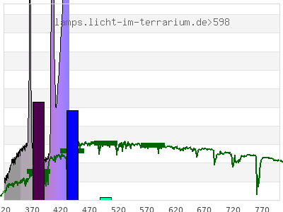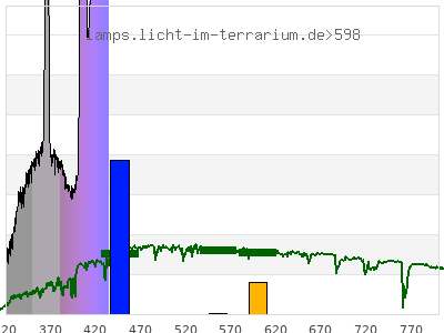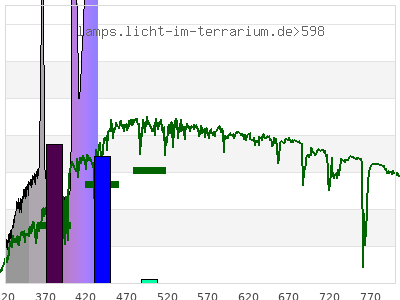 total ( 0 nm - 0 nm) 1060 µW/cm² = 10.6 W/m² UVC ( 0 nm - 280 nm) 21.8 µW/cm² = 0.218 W/m² non-terrestrial ( 0 nm - 290 nm) 25.3 µW/cm² = 0.253 W/m² total2 ( 250 nm - 880 nm) 1060 µW/cm² = 10.6 W/m² UVB (EU) ( 280 nm - 315 nm) 28.4 µW/cm² = 0.284 W/m² UVB (US) ( 280 nm - 320 nm) 34.8 µW/cm² = 0.348 W/m² UVA+B ( 280 nm - 380 nm) 295 µW/cm² = 2.95 W/m² Solar UVB ( 290 nm - 315 nm) 24.9 µW/cm² = 0.249 W/m² UVA D3 regulating ( 315 nm - 335 nm) 40.3 µW/cm² = 0.403 W/m² UVA (EU) ( 315 nm - 380 nm) 267 µW/cm² = 2.67 W/m² UVA2 (medical definition) ( 320 nm - 340 nm) 49 µW/cm² = 0.49 W/m² UVA (US) ( 320 nm - 380 nm) 260 µW/cm² = 2.6 W/m² UVA1 (variant) ( 335 nm - 380 nm) 227 µW/cm² = 2.27 W/m² UVA1 (medical) ( 340 nm - 400 nm) 282 µW/cm² = 2.82 W/m² vis. UVA ( 350 nm - 380 nm) 173 µW/cm² = 1.73 W/m² VIS Rep3 ( 350 nm - 600 nm) 911 µW/cm² = 9.11 W/m² VIS Rep4 ( 350 nm - 700 nm) 911 µW/cm² = 9.11 W/m² purple ( 380 nm - 420 nm) 412 µW/cm² = 4.12 W/m² VIS ( 380 nm - 780 nm) 738 µW/cm² = 7.38 W/m² VIS2 ( 400 nm - 680 nm) 667 µW/cm² = 6.67 W/m² PAR ( 400 nm - 700 nm) 667 µW/cm² = 6.67 W/m² tmp ( 400 nm - 1100 nm) 667 µW/cm² = 6.67 W/m² blue ( 420 nm - 490 nm) 327 µW/cm² = 3.27 W/m² green ( 490 nm - 575 nm) 0 µW/cm² = 0 W/m² yellow ( 575 nm - 585 nm) 0 µW/cm² = 0 W/m² orange ( 585 nm - 650 nm) 0 µW/cm² = 0 W/m² red ( 650 nm - 780 nm) 0 µW/cm² = 0 W/m² IR2 ( 655 nm - 685 nm) 0 µW/cm² = 0 W/m² IRA ( 700 nm - 1400 nm) 0 µW/cm² = 0 W/m² IRB ( 1400 nm - 3000 nm) 0 µW/cm² = 0 W/m²