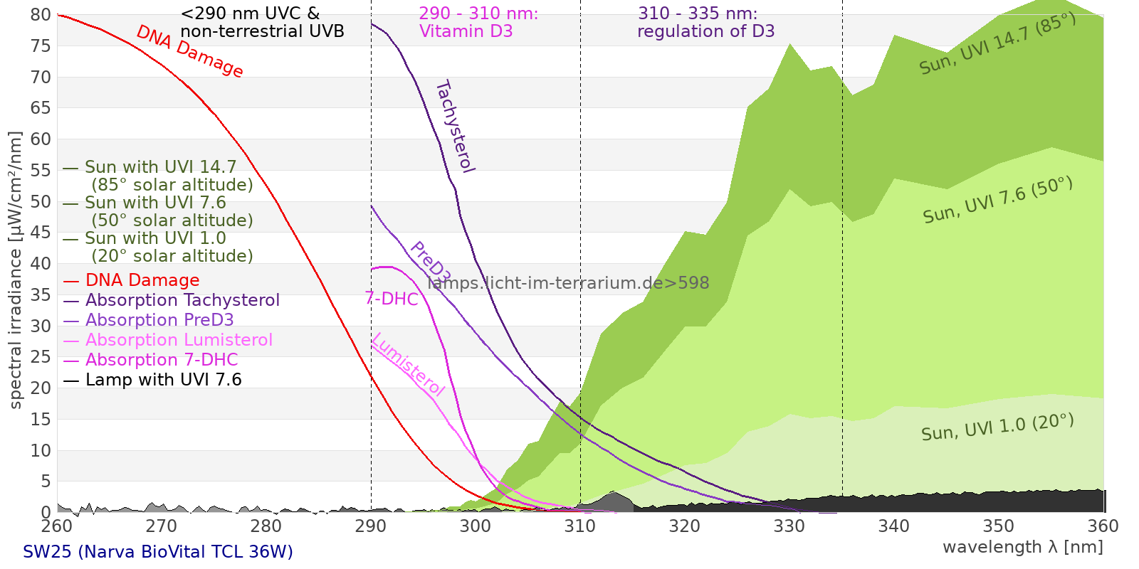 Erythema 12.9 UV-Index Pyrimidine dimerization of DNA 13.5 µW/cm² Photoceratitis 13.3 µW/cm² Photoconjunctivitis 19.3 µW/cm² DNA Damage 22 Vitamin D3 14.9 µW/cm² Photosynthesis 538 µW/cm² Luminosity 82.3 lx Human L-Cone 10.6 µW/cm² Human M-Cone 13.7 µW/cm² Human S-Cone 298 µW/cm² CIE X 91.5 µW/cm² CIE Y 3.46 µW/cm² CIE Z 444 µW/cm² PAR PPFD 37.9 µmol/m²/s Extinction preD3 243 e-3*m²/mol Extinction Tachysterol 565 e-3*m²/mol Exctincition PreD3 216000 m²/mol Extinction Lumisterol 185 m²/mol Exctincition Tachysterol 722000 m²/mol Extinction 7DHC 218 m²/mol L-Cone 0.597 µW/cm² M-Cone 19.5 µW/cm² S-Cone 705 µW/cm² U-Cone 771 µW/cm² UVR - ICNIRP 2004 21.9 Rel Biol Eff Melatonin Supression 371 µW/cm² Blue Light Hazard 425 µW/cm² (5160 µW/cm² per 1000 lx) CIE 174:2006 PreVit D3 15.1 µW/cm² Lumen Reptil 2730 "pseudo-lx" Vitamin D3 Degradation 13.9 µW/cm² Actinic UV 21.8 µW/cm² (2650 mW/klm) Exctincition Lumisterol 198000 m²/mol Exctincition 7DHC 226000 m²/mol Exctincition Toxisterols 95300 m²/mol