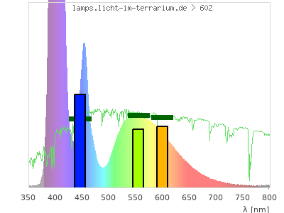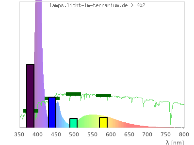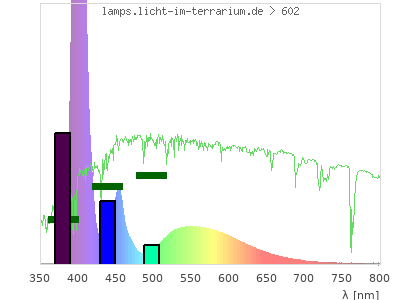 total ( 0 nm - 0 nm) 1820 µW/cm² = 18.2 W/m² UVC ( 0 nm - 280 nm) 1.42 µW/cm² = 0.0142 W/m² non-terrestrial ( 0 nm - 290 nm) 31 µW/cm² = 0.31 W/m² total2 ( 250 nm - 880 nm) 1820 µW/cm² = 18.2 W/m² UVB (EU) ( 280 nm - 315 nm) 241 µW/cm² = 2.41 W/m² UVB (US) ( 280 nm - 320 nm) 244 µW/cm² = 2.44 W/m² UVA+B ( 280 nm - 380 nm) 257 µW/cm² = 2.57 W/m² Solar UVB ( 290 nm - 315 nm) 211 µW/cm² = 2.11 W/m² UVA D3 regulating ( 315 nm - 335 nm) 7.55 µW/cm² = 0.0755 W/m² UVA (EU) ( 315 nm - 380 nm) 16.6 µW/cm² = 0.166 W/m² UVA2 (medical definition) ( 320 nm - 340 nm) 4.71 µW/cm² = 0.0471 W/m² UVA (US) ( 320 nm - 380 nm) 13.2 µW/cm² = 0.132 W/m² UVA1 (variant) ( 335 nm - 380 nm) 9.07 µW/cm² = 0.0907 W/m² UVA1 (medical) ( 340 nm - 400 nm) 431 µW/cm² = 4.31 W/m² vis. UVA ( 350 nm - 380 nm) 7.77 µW/cm² = 0.0777 W/m² VIS Rep3 ( 350 nm - 600 nm) 1450 µW/cm² = 14.5 W/m² VIS Rep4 ( 350 nm - 700 nm) 1560 µW/cm² = 15.6 W/m² purple ( 380 nm - 420 nm) 994 µW/cm² = 9.94 W/m² VIS ( 380 nm - 780 nm) 1560 µW/cm² = 15.6 W/m² VIS2 ( 400 nm - 680 nm) 1120 µW/cm² = 11.2 W/m² PAR ( 400 nm - 700 nm) 1130 µW/cm² = 11.3 W/m² tmp ( 400 nm - 1100 nm) 1140 µW/cm² = 11.4 W/m² blue ( 420 nm - 490 nm) 190 µW/cm² = 1.9 W/m² green ( 490 nm - 575 nm) 199 µW/cm² = 1.99 W/m² yellow ( 575 nm - 585 nm) 27 µW/cm² = 0.27 W/m² orange ( 585 nm - 650 nm) 111 µW/cm² = 1.11 W/m² red ( 650 nm - 780 nm) 37 µW/cm² = 0.37 W/m² IRA ( 700 nm - 1400 nm) 16.7 µW/cm² = 0.167 W/m² IR2 ( 720 nm - 1100 nm) 12.2 µW/cm² = 0.122 W/m² IRB ( 1400 nm - 3000 nm) 0 µW/cm² = 0 W/m²