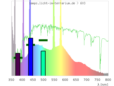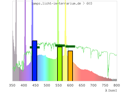 Whereas a spectrometer measures the intensity in every tiny wavelength interval resulting in thousands of individual intensities, the human eye only measures three intensities detected by the three cones. The same is true for the reptile eye with usually three or four photoreceptors. Effectively the detailled spectrum displayed above reduces to a much compacter bar graph displayed below. The photoreceptor sensitivites from these L-Cone, M-Cone, S-Cone, and U-Cone are used, they are chosen as an average of measured reptile photoreceptor sensitivity curves. The bar graph also shows as reference the intensity seen by the three or four photoreceptors for average sunlight (id 1).