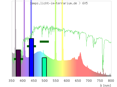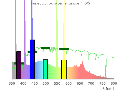 Whereas a spectrometer measures the intensity in every tiny wavelength interval resulting in thousands of individual intensities, the human eye only measures three intensities detected by the three cones. The same is true for the reptile eye with usually three or four photoreceptors. Effectively the detailled spectrum displayed above reduces to a much compacter bar graph displayed below. The photoreceptor sensitivites from these L-Cone, M-Cone, S-Cone, and U-Cone are used, they are chosen as an average of measured reptile photoreceptor sensitivity curves. The bar graph also shows as reference the intensity seen by the three or four photoreceptors for average sunlight (id 1).