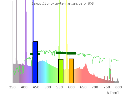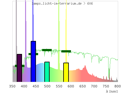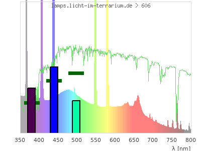 Whereas a spectrometer measures the intensity in every tiny wavelength interval resulting in thousands of individual intensities, the human eye only measures three intensities detected by the three cones. The same is true for the reptile eye with usually three or four photoreceptors. Effectively the detailled spectrum displayed above reduces to a much compacter bar graph displayed below. The photoreceptor sensitivites from these L-Cone, M-Cone, S-Cone, and U-Cone are used, they are chosen as an average of measured reptile photoreceptor sensitivity curves. The bar graph also shows as reference the intensity seen by the three or four photoreceptors for average sunlight (id 1).