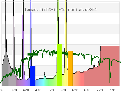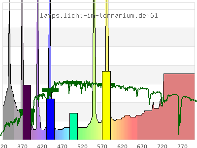 total ( 0 nm - 0 nm) 18400 µW/cm² = 184 W/m² UVC ( 0 nm - 280 nm) 0.0295 µW/cm² = 0.000295 W/m² non-terrestrial ( 0 nm - 290 nm) 0.91 µW/cm² = 0.0091 W/m² total2 ( 250 nm - 880 nm) 18400 µW/cm² = 184 W/m² UVB (EU) ( 280 nm - 315 nm) 436 µW/cm² = 4.36 W/m² UVB (US) ( 280 nm - 320 nm) 667 µW/cm² = 6.67 W/m² UVA+B ( 280 nm - 380 nm) 3540 µW/cm² = 35.4 W/m² Solar UVB ( 290 nm - 315 nm) 435 µW/cm² = 4.35 W/m² UVA D3 regulating ( 315 nm - 335 nm) 817 µW/cm² = 8.17 W/m² UVA (EU) ( 315 nm - 380 nm) 3090 µW/cm² = 30.9 W/m² UVA2 (medical definition) ( 320 nm - 340 nm) 880 µW/cm² = 8.8 W/m² UVA (US) ( 320 nm - 380 nm) 2880 µW/cm² = 28.8 W/m² UVA1 (variant) ( 335 nm - 380 nm) 2260 µW/cm² = 22.6 W/m² UVA1 (medical) ( 340 nm - 400 nm) 2200 µW/cm² = 22 W/m² vis. UVA ( 350 nm - 380 nm) 1640 µW/cm² = 16.4 W/m² VIS Rep3 ( 350 nm - 600 nm) 10100 µW/cm² = 101 W/m² VIS Rep4 ( 350 nm - 700 nm) 12000 µW/cm² = 120 W/m² purple ( 380 nm - 420 nm) 1100 µW/cm² = 11 W/m² VIS ( 380 nm - 780 nm) 13900 µW/cm² = 139 W/m² VIS2 ( 400 nm - 680 nm) 9710 µW/cm² = 97.1 W/m² PAR ( 400 nm - 700 nm) 10200 µW/cm² = 102 W/m² tmp ( 400 nm - 1100 nm) 14600 µW/cm² = 146 W/m² blue ( 420 nm - 490 nm) 1530 µW/cm² = 15.3 W/m² green ( 490 nm - 575 nm) 3600 µW/cm² = 36 W/m² yellow ( 575 nm - 585 nm) 2000 µW/cm² = 20 W/m² orange ( 585 nm - 650 nm) 1090 µW/cm² = 10.9 W/m² red ( 650 nm - 780 nm) 4590 µW/cm² = 45.9 W/m² IR2 ( 655 nm - 685 nm) 620 µW/cm² = 6.2 W/m² IRA ( 700 nm - 1400 nm) 4450 µW/cm² = 44.5 W/m² IRB ( 1400 nm - 3000 nm) 0 µW/cm² = 0 W/m²