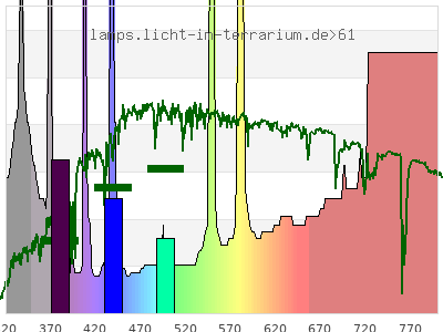 Whereas a spectrometer measures the intensity in every tiny wavelength interval resulting in thousands of individual intensities, the human eye only measures three intensities detected by the three cones. The same is true for the reptile eye with usually three or four photoreceptors. Effectively the detailled spectrum displayed above reduces to a much compacter bar graph displayed below. The photoreceptor sensitivites from these L-Cone, M-Cone, S-Cone, and U-Cone are used, they are chosen as an average of measured reptile photoreceptor sensitivity curves. The bar graph also shows as reference the intensity seen by the three or four photoreceptors for average sunlight (ASTM spectrum).