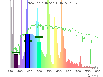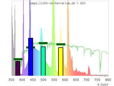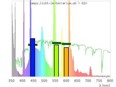 total ( 0 nm - 0 nm) 7380 µW/cm² = 73.8 W/m² UVC ( 0 nm - 280 nm) 401 µW/cm² = 4.01 W/m² non-terrestrial ( 0 nm - 290 nm) 405 µW/cm² = 4.05 W/m² total2 ( 250 nm - 880 nm) 6980 µW/cm² = 69.8 W/m² UVB (EU) ( 280 nm - 315 nm) 448 µW/cm² = 4.48 W/m² UVB (US) ( 280 nm - 320 nm) 752 µW/cm² = 7.52 W/m² UVA+B ( 280 nm - 380 nm) 2970 µW/cm² = 29.7 W/m² Solar UVB ( 290 nm - 315 nm) 445 µW/cm² = 4.45 W/m² UVA D3 regulating ( 315 nm - 335 nm) 1260 µW/cm² = 12.6 W/m² UVA (EU) ( 315 nm - 380 nm) 2520 µW/cm² = 25.2 W/m² UVA2 (medical definition) ( 320 nm - 340 nm) 1260 µW/cm² = 12.6 W/m² UVA (US) ( 320 nm - 380 nm) 2220 µW/cm² = 22.2 W/m² UVA1 (variant) ( 335 nm - 380 nm) 1270 µW/cm² = 12.7 W/m² UVA1 (medical) ( 340 nm - 400 nm) 986 µW/cm² = 9.86 W/m² vis. UVA ( 350 nm - 380 nm) 442 µW/cm² = 4.42 W/m² VIS Rep3 ( 350 nm - 600 nm) 3720 µW/cm² = 37.2 W/m² VIS Rep4 ( 350 nm - 700 nm) 4390 µW/cm² = 43.9 W/m² purple ( 380 nm - 420 nm) 281 µW/cm² = 2.81 W/m² VIS ( 380 nm - 780 nm) 4000 µW/cm² = 40 W/m² VIS2 ( 400 nm - 680 nm) 3900 µW/cm² = 39 W/m² PAR ( 400 nm - 700 nm) 3920 µW/cm² = 39.2 W/m² tmp ( 400 nm - 1100 nm) 3980 µW/cm² = 39.8 W/m² blue ( 420 nm - 490 nm) 1340 µW/cm² = 13.4 W/m² green ( 490 nm - 575 nm) 1330 µW/cm² = 13.3 W/m² yellow ( 575 nm - 585 nm) 181 µW/cm² = 1.81 W/m² orange ( 585 nm - 650 nm) 718 µW/cm² = 7.18 W/m² red ( 650 nm - 780 nm) 151 µW/cm² = 1.51 W/m² IRA ( 700 nm - 1400 nm) 61.3 µW/cm² = 0.613 W/m² IR2 ( 720 nm - 1100 nm) 16.9 µW/cm² = 0.169 W/m² IRB ( 1400 nm - 3000 nm) 0 µW/cm² = 0 W/m²