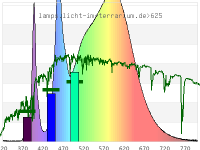 Whereas a spectrometer measures the intensity in every tiny wavelength interval resulting in thousands of individual intensities, the human eye only measures three intensities detected by the three cones. The same is true for the reptile eye with usually three or four photoreceptors. Effectively the detailled spectrum displayed above reduces to a much compacter bar graph displayed below. The photoreceptor sensitivites from these L-Cone, M-Cone, S-Cone, and U-Cone are used, they are chosen as an average of measured reptile photoreceptor sensitivity curves. The bar graph also shows as reference the intensity seen by the three or four photoreceptors for average sunlight (ASTM spectrum).