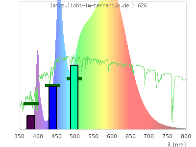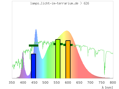 Whereas a spectrometer measures the intensity in every tiny wavelength interval resulting in thousands of individual intensities, the human eye only measures three intensities detected by the three cones. The same is true for the reptile eye with usually three or four photoreceptors. Effectively the detailled spectrum displayed above reduces to a much compacter bar graph displayed below. The photoreceptor sensitivites from these L-Cone, M-Cone, S-Cone, and U-Cone are used, they are chosen as an average of measured reptile photoreceptor sensitivity curves. The bar graph also shows as reference the intensity seen by the three or four photoreceptors for average sunlight (id 1).