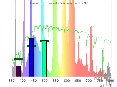 Whereas a spectrometer measures the intensity in every tiny wavelength interval resulting in thousands of individual intensities, the human eye only measures three intensities detected by the three cones. The same is true for the reptile eye with usually three or four photoreceptors. Effectively the detailled spectrum displayed above reduces to a much compacter bar graph displayed below. The photoreceptor sensitivites from these L-Cone, M-Cone, S-Cone, and U-Cone are used, they are chosen as an average of measured reptile photoreceptor sensitivity curves. The bar graph also shows as reference the intensity seen by the three or four photoreceptors for average sunlight (id 1).