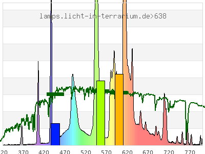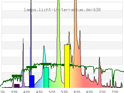 total ( 0 nm - 0 nm) 4730 µW/cm² = 47.3 W/m² UVC ( 0 nm - 280 nm) 0 µW/cm² = 0 W/m² non-terrestrial ( 0 nm - 290 nm) 0 µW/cm² = 0 W/m² total2 ( 250 nm - 880 nm) 4730 µW/cm² = 47.3 W/m² UVB (EU) ( 280 nm - 315 nm) 3 µW/cm² = 0.03 W/m² UVB (US) ( 280 nm - 320 nm) 3.57 µW/cm² = 0.0357 W/m² UVA+B ( 280 nm - 380 nm) 38.1 µW/cm² = 0.381 W/m² Solar UVB ( 290 nm - 315 nm) 3 µW/cm² = 0.03 W/m² UVA D3 regulating ( 315 nm - 335 nm) 3.19 µW/cm² = 0.0319 W/m² UVA (EU) ( 315 nm - 380 nm) 35.1 µW/cm² = 0.351 W/m² UVA2 (medical definition) ( 320 nm - 340 nm) 3.58 µW/cm² = 0.0358 W/m² UVA (US) ( 320 nm - 380 nm) 34.6 µW/cm² = 0.346 W/m² UVA1 (variant) ( 335 nm - 380 nm) 31.9 µW/cm² = 0.319 W/m² UVA1 (medical) ( 340 nm - 400 nm) 39.1 µW/cm² = 0.391 W/m² vis. UVA ( 350 nm - 380 nm) 28.6 µW/cm² = 0.286 W/m² VIS Rep3 ( 350 nm - 600 nm) 2500 µW/cm² = 25 W/m² VIS Rep4 ( 350 nm - 700 nm) 4350 µW/cm² = 43.5 W/m² purple ( 380 nm - 420 nm) 111 µW/cm² = 1.11 W/m² VIS ( 380 nm - 780 nm) 4550 µW/cm² = 45.5 W/m² VIS2 ( 400 nm - 680 nm) 4240 µW/cm² = 42.4 W/m² PAR ( 400 nm - 700 nm) 4310 µW/cm² = 43.1 W/m² tmp ( 400 nm - 1100 nm) 4680 µW/cm² = 46.8 W/m² blue ( 420 nm - 490 nm) 536 µW/cm² = 5.36 W/m² green ( 490 nm - 575 nm) 1300 µW/cm² = 13 W/m² yellow ( 575 nm - 585 nm) 213 µW/cm² = 2.13 W/m² orange ( 585 nm - 650 nm) 1920 µW/cm² = 19.2 W/m² red ( 650 nm - 780 nm) 477 µW/cm² = 4.77 W/m² IR2 ( 655 nm - 685 nm) 141 µW/cm² = 1.41 W/m² IRA ( 700 nm - 1400 nm) 370 µW/cm² = 3.7 W/m² IRB ( 1400 nm - 3000 nm) 0 µW/cm² = 0 W/m²