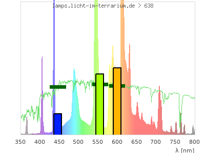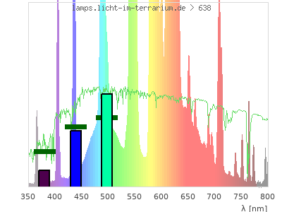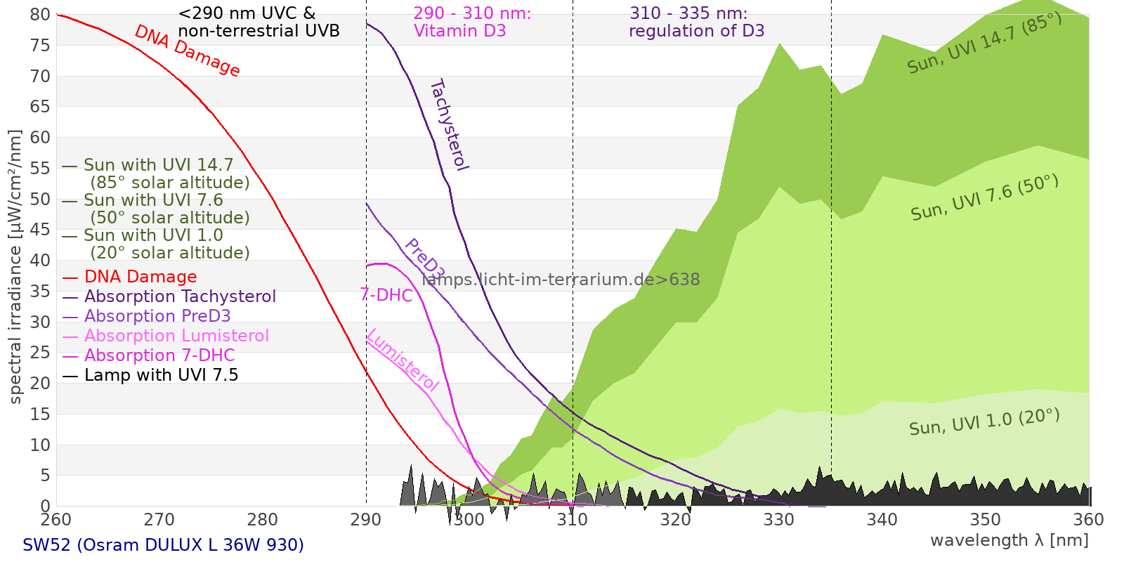 Erythema 0.54 UV-Index Pyrimidine dimerization of DNA 1.76 µW/cm² Photoceratitis 0.767 µW/cm² Photoconjunctivitis 0.031 µW/cm² DNA Damage 0.116 Vitamin D3 1.68 µW/cm² Photosynthesis 2740 µW/cm² Luminosity 16200 lx Human L-Cone 2550 µW/cm² Human M-Cone 1750 µW/cm² Human S-Cone 405 µW/cm² CIE X 2470 µW/cm² CIE Y 2240 µW/cm² CIE Z 771 µW/cm² PAR PPFD 211 µmol/m²/s Extinction preD3 6.71 e-3*m²/mol Extinction Tachysterol 25.7 e-3*m²/mol Exctincition PreD3 3620 m²/mol Extinction Lumisterol 3.62 m²/mol Exctincition Tachysterol 34700 m²/mol Extinction 7DHC 5.11 m²/mol L-Cone 2300 µW/cm² M-Cone 1090 µW/cm² S-Cone 659 µW/cm² U-Cone 192 µW/cm² UVR - ICNIRP 2004 0.629 Rel Biol Eff Melatonin Supression 679 µW/cm² Blue Light Hazard 461 µW/cm² (28.6 µW/cm² per 1000 lx) CIE 174:2006 PreVit D3 1.77 µW/cm² Lumen Reptil 11500 "pseudo-lx" Vitamin D3 Degradation 0.953 µW/cm² Actinic UV 0.625 µW/cm² (0.387 mW/klm) Exctincition Lumisterol 4370 m²/mol Exctincition 7DHC 6250 m²/mol Exctincition Toxisterols 381 m²/mol