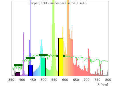 Whereas a spectrometer measures the intensity in every tiny wavelength interval resulting in thousands of individual intensities, the human eye only measures three intensities detected by the three cones. The same is true for the reptile eye with usually three or four photoreceptors. Effectively the detailled spectrum displayed above reduces to a much compacter bar graph displayed below. The photoreceptor sensitivites from these L-Cone, M-Cone, S-Cone, and U-Cone are used, they are chosen as an average of measured reptile photoreceptor sensitivity curves. The bar graph also shows as reference the intensity seen by the three or four photoreceptors for average sunlight (id 1).