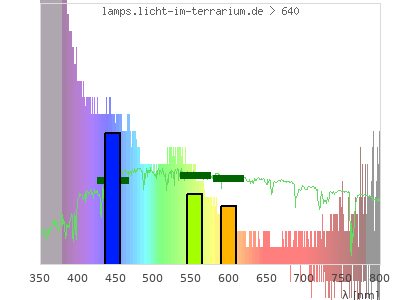total ( 0 nm - 0 nm) 4900 µW/cm² = 49 W/m² UVC ( 0 nm - 280 nm) 19.9 µW/cm² = 0.199 W/m² non-terrestrial ( 0 nm - 290 nm) 56.8 µW/cm² = 0.568 W/m² total2 ( 250 nm - 880 nm) 4900 µW/cm² = 49 W/m² UVB (EU) ( 280 nm - 315 nm) 4360 µW/cm² = 43.6 W/m² UVB (US) ( 280 nm - 320 nm) 4620 µW/cm² = 46.2 W/m² UVA+B ( 280 nm - 380 nm) 4850 µW/cm² = 48.5 W/m² Solar UVB ( 290 nm - 315 nm) 4320 µW/cm² = 43.2 W/m² UVA D3 regulating ( 315 nm - 335 nm) 450 µW/cm² = 4.5 W/m² UVA (EU) ( 315 nm - 380 nm) 493 µW/cm² = 4.93 W/m² UVA2 (medical definition) ( 320 nm - 340 nm) 205 µW/cm² = 2.05 W/m² UVA (US) ( 320 nm - 380 nm) 233 µW/cm² = 2.33 W/m² UVA1 (variant) ( 335 nm - 380 nm) 42.7 µW/cm² = 0.427 W/m² UVA1 (medical) ( 340 nm - 400 nm) 31 µW/cm² = 0.31 W/m² vis. UVA ( 350 nm - 380 nm) 13.2 µW/cm² = 0.132 W/m² VIS Rep3 ( 350 nm - 600 nm) 28.3 µW/cm² = 0.283 W/m² VIS Rep4 ( 350 nm - 700 nm) 29.3 µW/cm² = 0.293 W/m² purple ( 380 nm - 420 nm) 4.59 µW/cm² = 0.0459 W/m² VIS ( 380 nm - 780 nm) 16.8 µW/cm² = 0.168 W/m² VIS2 ( 400 nm - 680 nm) 13.3 µW/cm² = 0.133 W/m² PAR ( 400 nm - 700 nm) 13.4 µW/cm² = 0.134 W/m² tmp ( 400 nm - 1100 nm) 22.1 µW/cm² = 0.221 W/m² blue ( 420 nm - 490 nm) 5.38 µW/cm² = 0.0538 W/m² green ( 490 nm - 575 nm) 4.55 µW/cm² = 0.0455 W/m² yellow ( 575 nm - 585 nm) 0.311 µW/cm² = 0.00311 W/m² orange ( 585 nm - 650 nm) 0.964 µW/cm² = 0.00964 W/m² red ( 650 nm - 780 nm) 1.01 µW/cm² = 0.0101 W/m² IRA ( 700 nm - 1400 nm) 8.68 µW/cm² = 0.0868 W/m² IR2 ( 720 nm - 1100 nm) 8.58 µW/cm² = 0.0858 W/m² IRB ( 1400 nm - 3000 nm) 0 µW/cm² = 0 W/m²