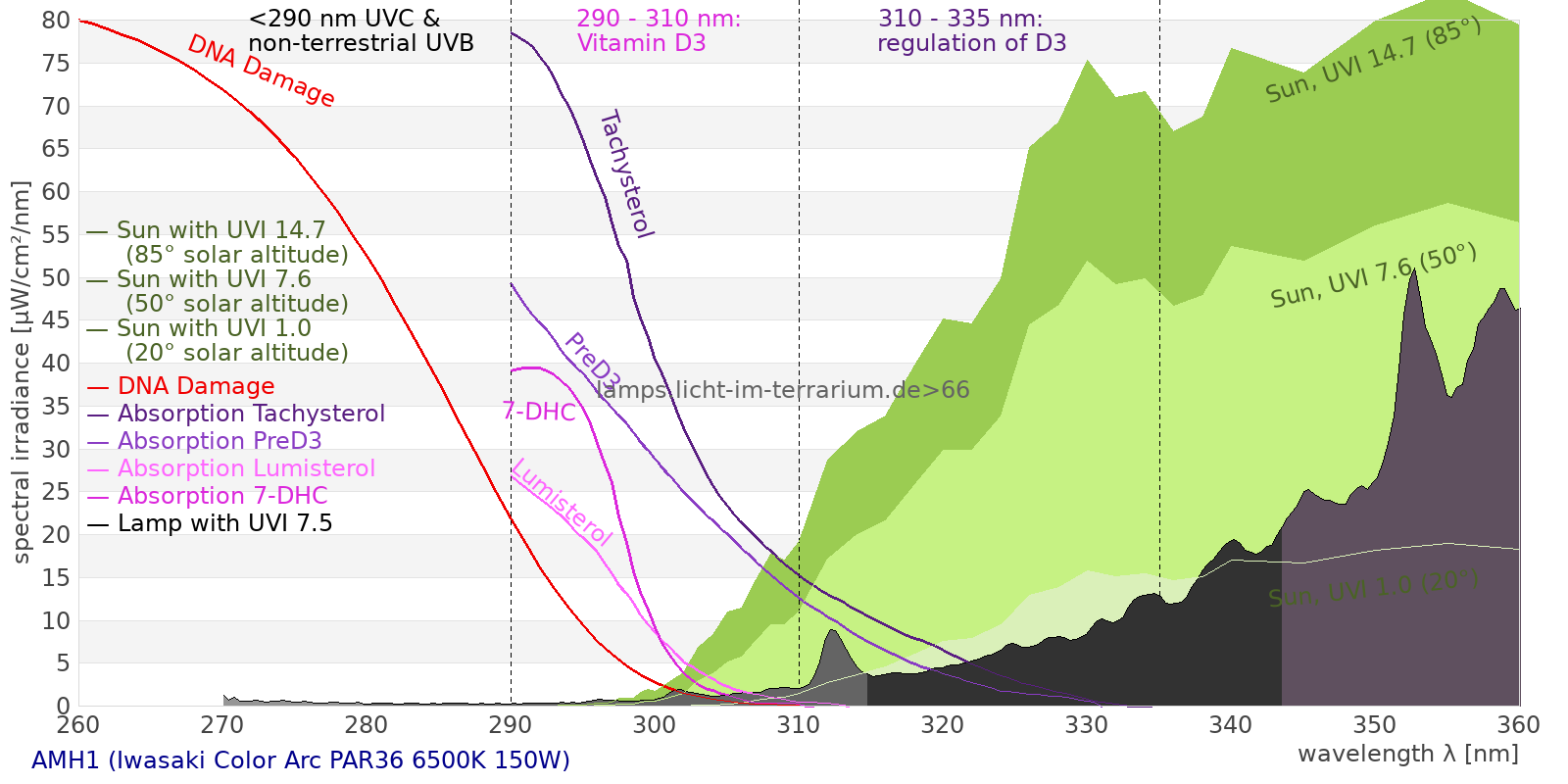 Erythema 10.4 UV-Index Pyrimidine dimerization of DNA 38.9 µW/cm² Photoceratitis 13.4 µW/cm² Photoconjunctivitis 5.32 µW/cm² DNA Damage 7.89 Vitamin D3 25.6 µW/cm² Photosynthesis 41000 µW/cm² Luminosity 151000 lx Human L-Cone 22400 µW/cm² Human M-Cone 19200 µW/cm² Human S-Cone 12800 µW/cm² CIE X 19900 µW/cm² CIE Y 20900 µW/cm² CIE Z 23200 µW/cm² PAR PPFD 2690 µmol/m²/s Extinction preD3 187 e-3*m²/mol Extinction Tachysterol 632 e-3*m²/mol Exctincition PreD3 128000 m²/mol Extinction Lumisterol 106 m²/mol Exctincition Tachysterol 956000 m²/mol Extinction 7DHC 130 m²/mol L-Cone 18700 µW/cm² M-Cone 22900 µW/cm² S-Cone 21300 µW/cm² U-Cone 15600 µW/cm² UVR - ICNIRP 2004 15.2 Rel Biol Eff Melatonin Supression 19900 µW/cm² Blue Light Hazard 15300 µW/cm² (101 µW/cm² per 1000 lx) CIE 174:2006 PreVit D3 26.9 µW/cm² Lumen Reptil 177000 "pseudo-lx" Vitamin D3 Degradation 27.2 µW/cm² Actinic UV 15 µW/cm² (0.992 mW/klm) Exctincition Lumisterol 125000 m²/mol Exctincition 7DHC 147000 m²/mol Exctincition Toxisterols 19300 m²/mol