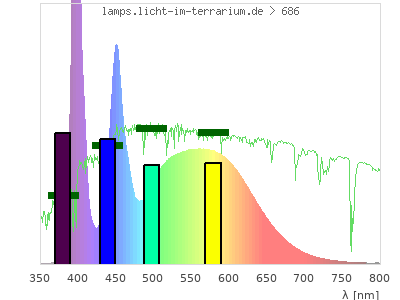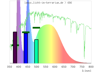 Whereas a spectrometer measures the intensity in every tiny wavelength interval resulting in thousands of individual intensities, the human eye only measures three intensities detected by the three cones. The same is true for the reptile eye with usually three or four photoreceptors. Effectively the detailled spectrum displayed above reduces to a much compacter bar graph displayed below. The photoreceptor sensitivites from these L-Cone, M-Cone, S-Cone, and U-Cone are used, they are chosen as an average of measured reptile photoreceptor sensitivity curves. The bar graph also shows as reference the intensity seen by the three or four photoreceptors for average sunlight (id 1).