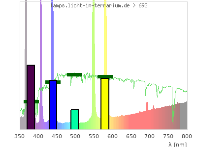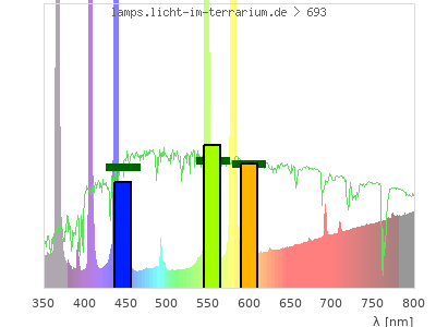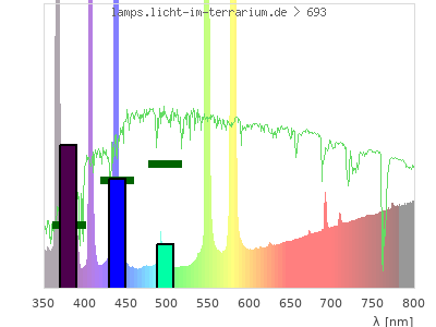 Whereas a spectrometer measures the intensity in every tiny wavelength interval resulting in thousands of individual intensities, the human eye only measures three intensities detected by the three cones. The same is true for the reptile eye with usually three or four photoreceptors. Effectively the detailled spectrum displayed above reduces to a much compacter bar graph displayed below. The photoreceptor sensitivites from these L-Cone, M-Cone, S-Cone, and U-Cone are used, they are chosen as an average of measured reptile photoreceptor sensitivity curves. The bar graph also shows as reference the intensity seen by the three or four photoreceptors for average sunlight (id 1).